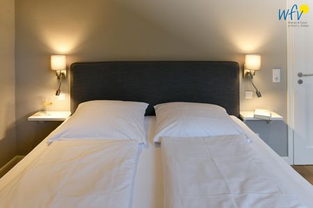 Im DG stehen Ihnen zwei weitere Schlafzimmer zur Verfügung. Eines davon ist mit einem Boxspringbett ausgestattet (180 x 200 cm), das andere mit zwei Einzelbetten (je 90 x 200 cm) und einem Kinderspieltisch für unsere kleinen Gäste. Auch in dieser Etage befindet sich ein hochwertiges Bad mit Dusche und WC.