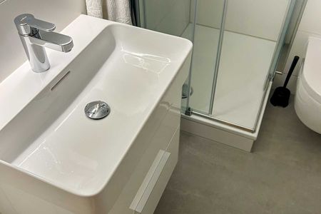 Nach einem Tag an der frischen Nordseeluft können Sie im eleganten Badezimmer in Ruhe abschalten und eine erfrischende Dusche genießen. Es verfügt zudem über Waschbecken, WC, einem beleuchteten und beheizbaren Spiegel und bietet Ihnen ausreichend Ablage- und Verstaumöglichkeiten für Ihre Bad- und Kosmetikutensilien.