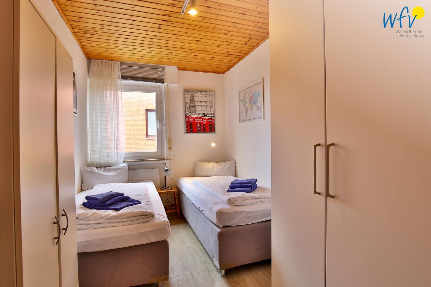 In dem separaten Schlafzimmer erwarten Sie zwei Einzelbetten sowie ausreichend Stauraum für Ihre Urlaubsgarderobe. Zwei weitere Schlafmöglichkeiten bestehen durch die Schlafcouch im Wohnraum, die schnell und einfach zu einem Doppelbett ausgeklappt werden kann.