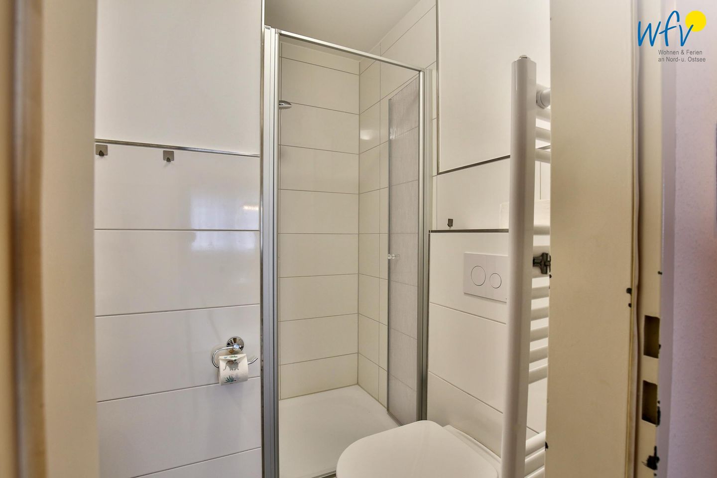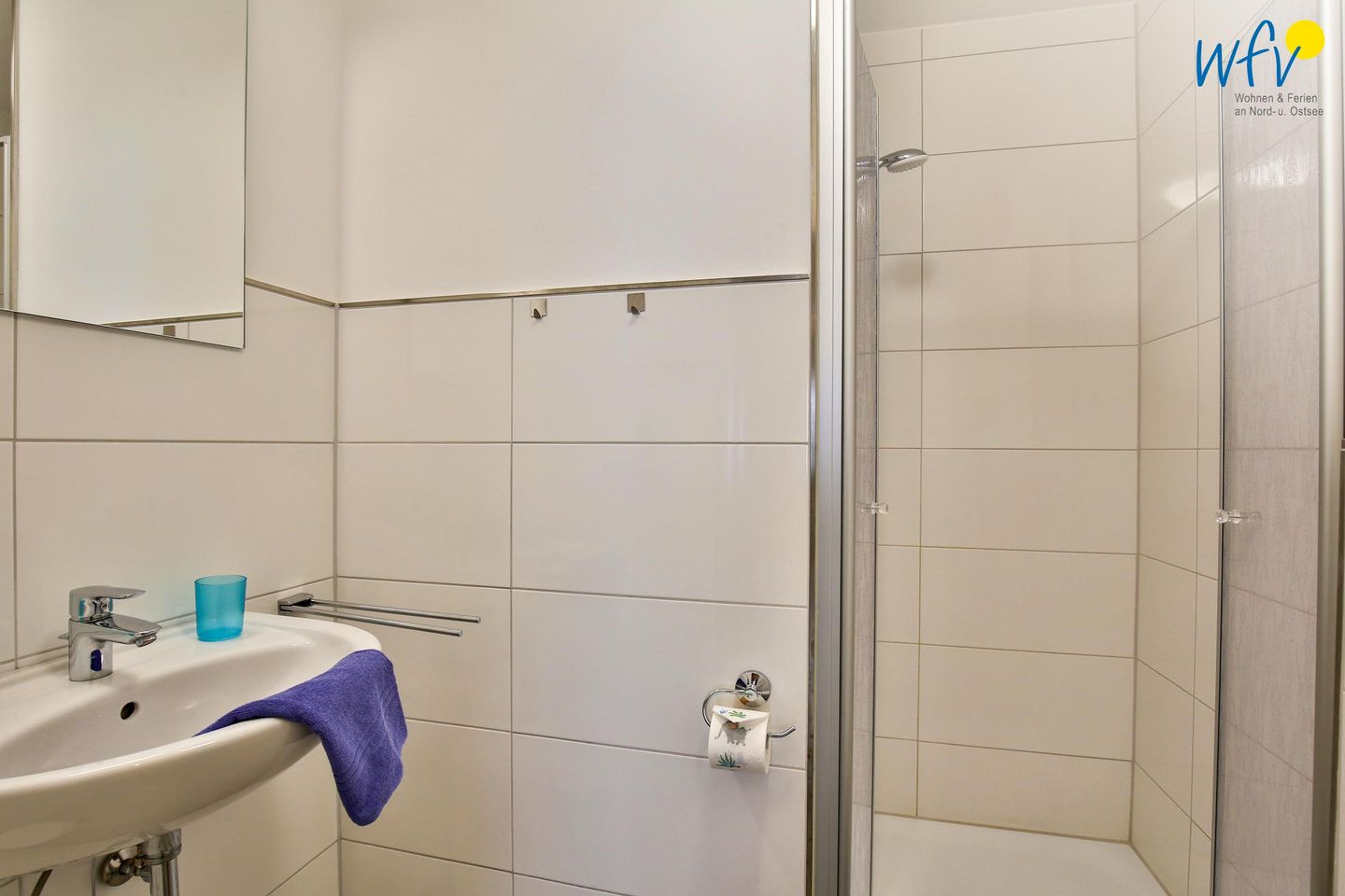 Ein gepflegtes Badezimmer mit Dusche ergänzt den Wohnkomfort.