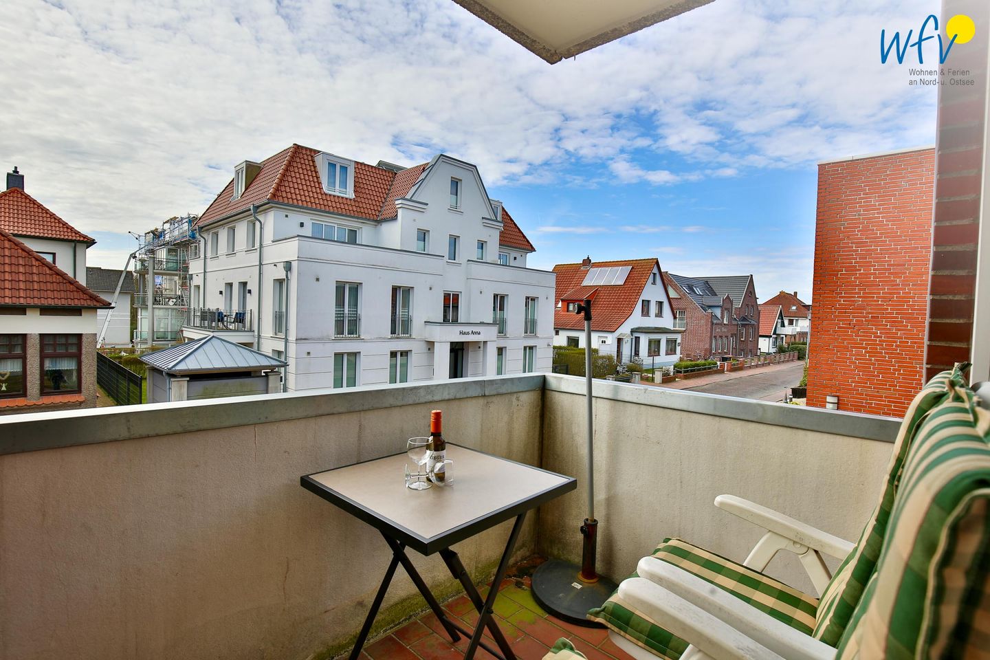 Klare Nordseeluft genießen Sie auf dem möblierten Balkon, der zum Ausspannen, Lesen und Träumen einlädt. Mit schönem Blick in die Umgebung können Sie wunderbar den Urlaubstag bei einem Glas Wein ausklingen lassen. Die Balkonüberdachung ermöglicht auch an leicht regnerischen Tagen einen Aufenthalt im Freien.