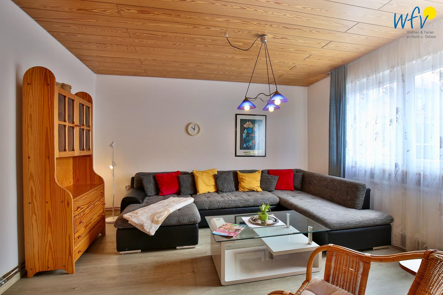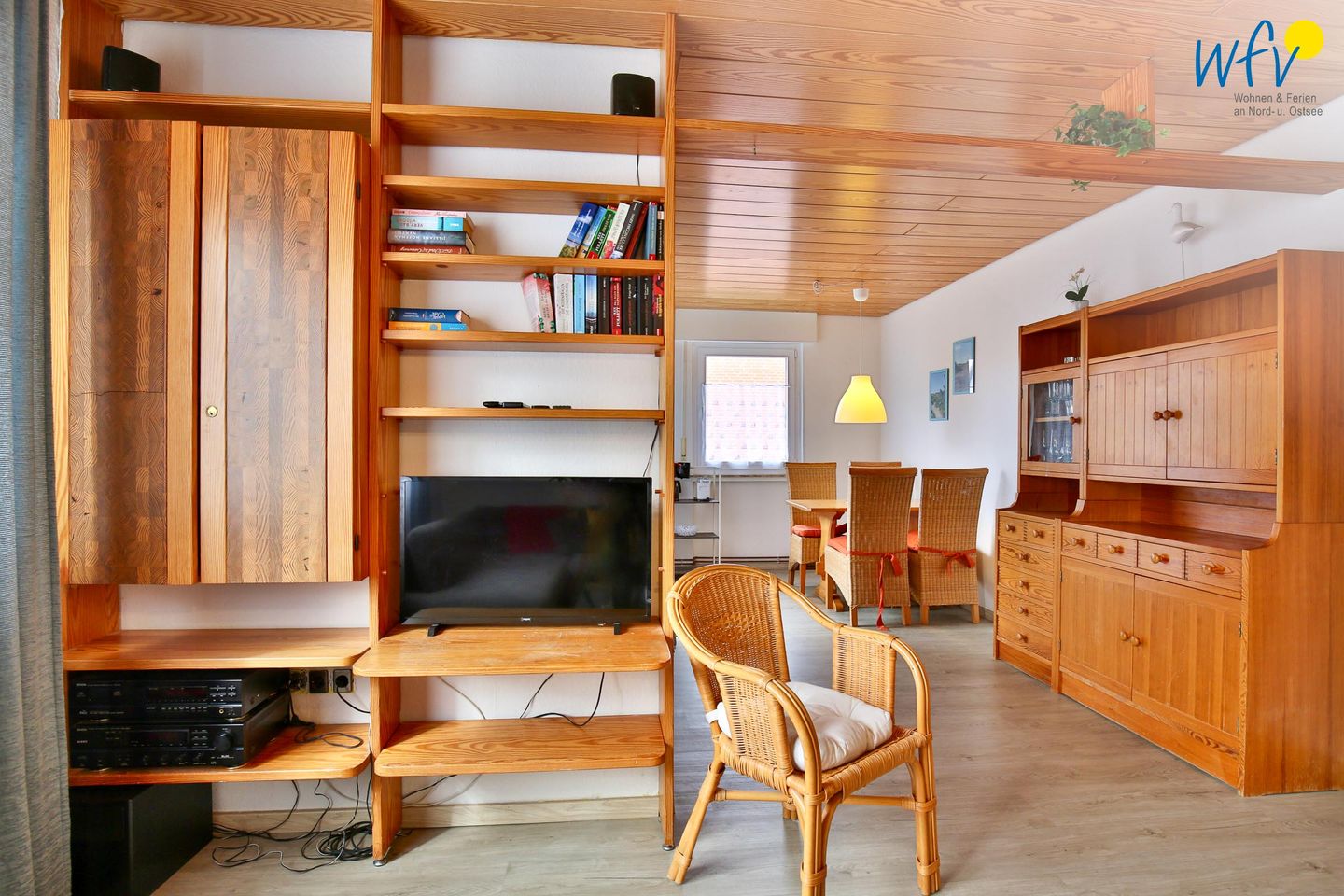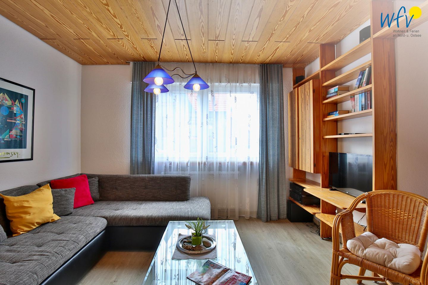 Weitere Gelegenheit zur Erholung bietet der helle Wohnraum, der mit einer gemütlichen Couchlandschaft mit TV sowie mit einem Essplatz ausgestattet ist.