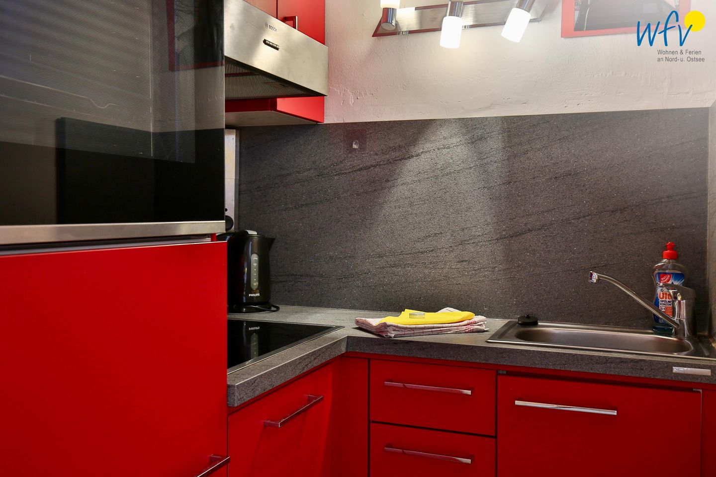 Für eine bequeme Selbstverpflegung verfügt die Wohnung über eine moderne Einbauküche - u.a. mit Induktionsherd, Backofen, Kühlschrank mit Gefrierfach, Spülmaschine und Mikrowelle sowie Kaffeemaschine, Wasserkocher und Toaster.
