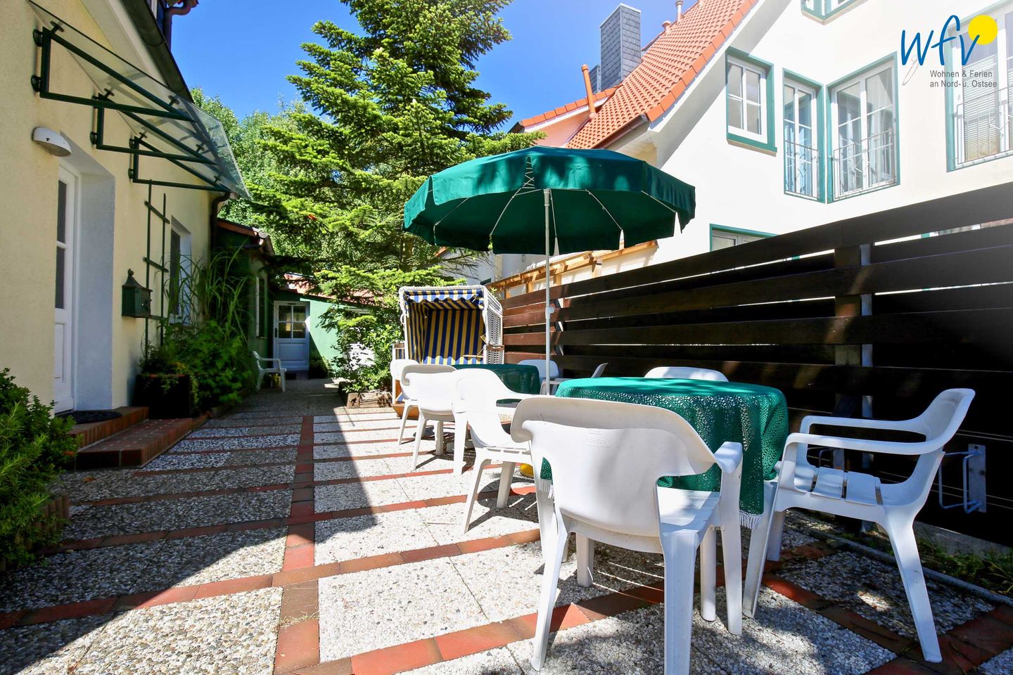 Auch der hübsche Außenbereich vor dem Haus bietet Gelegenheit zur Entspannung. Hier lädt eine gemeinschaftliche Sitzecke mit Strandkorb und Sonnenschirm zum Wohlfühlen ein - inklusive warmer Sonnenstrahlen und frischer Nordseeluft. Ihre Kinder dürfen gerne im angrenzenden Garten spielen.