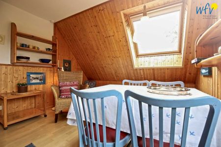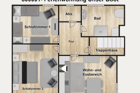 Die 70 m² große Ferienwohnung befindet sich im 1. Obergeschoss und verfügt über eine separate Küche mit Essplatz, zwei separate Schlafzimmer sowie über ein geräumiges Badezimmer mit Dusche, WC und Waschmaschine und einen Abstellraum.