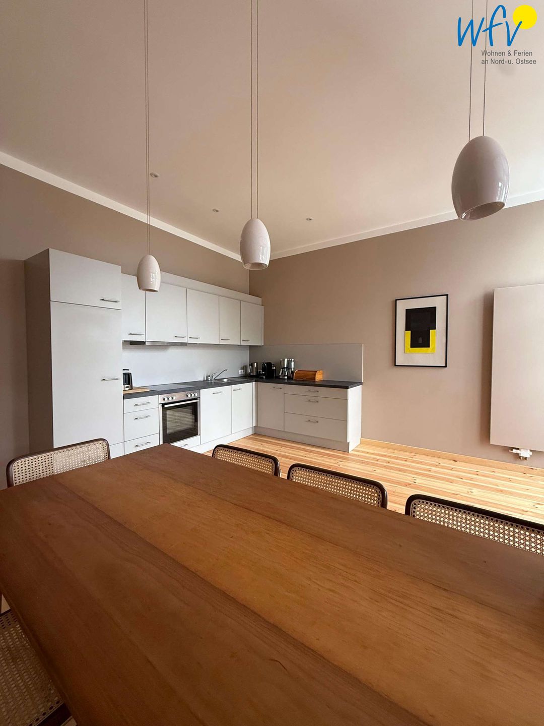 In dem geräumigen Wohn- und Essbereich erwartet Sie eine moderne Küche und ein schöner großer Esstisch. Zum Fernsehen, Lesen und Musik hören ist die anliegende gemütliche Loggia mit einer bequemen Sitzecke mit TV (40 Zoll) eingerichtet. Von der Loggia aus haben Sie einen freien und wunderschönen Blick auf die Ostsee!