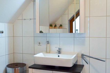 Das moderne Tageslichtbad mit Dusche, Spiegelschrank, Waschbecken und WC sorgt für weiteren Wohnkomfort.